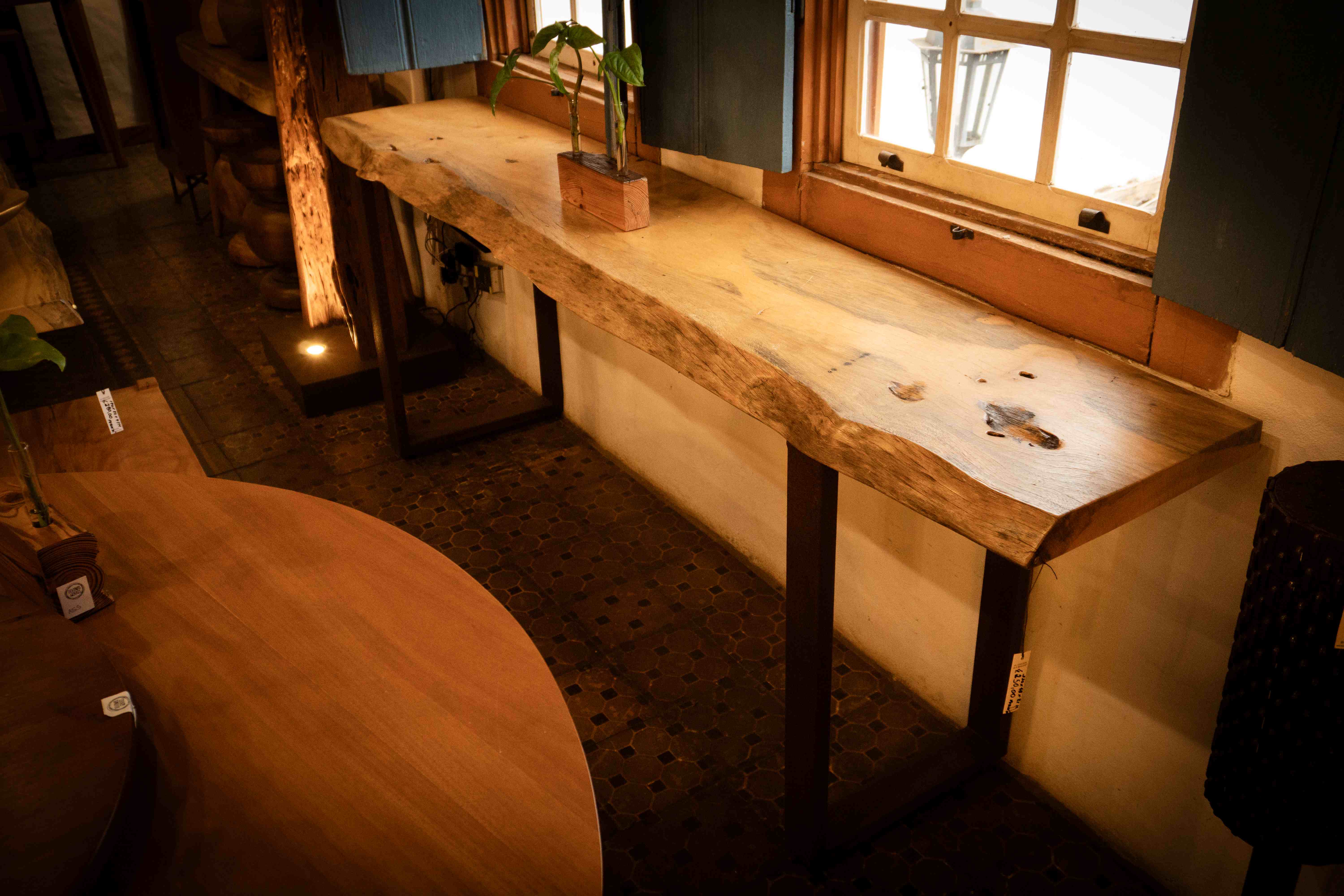 Desenho original, confeccionado em madeira maciça Pinho de Riga e tampo em marchetaria. Pode ser feito sob medida.